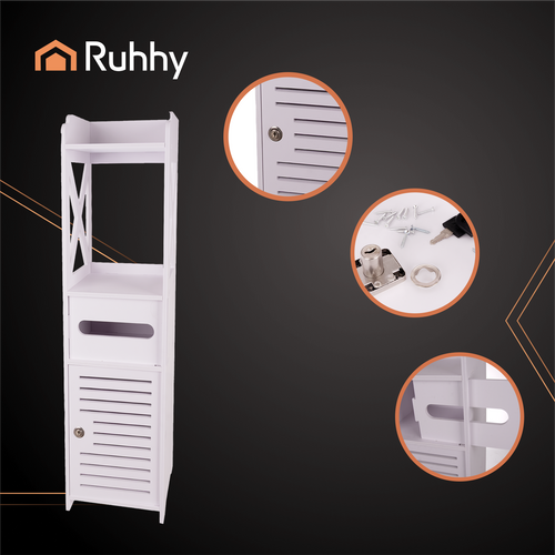 Volně stojící koupelnová skříňka s držákem toaletního papíru, uzamykatelná, sloupová police v bílé barvě RUHHY!