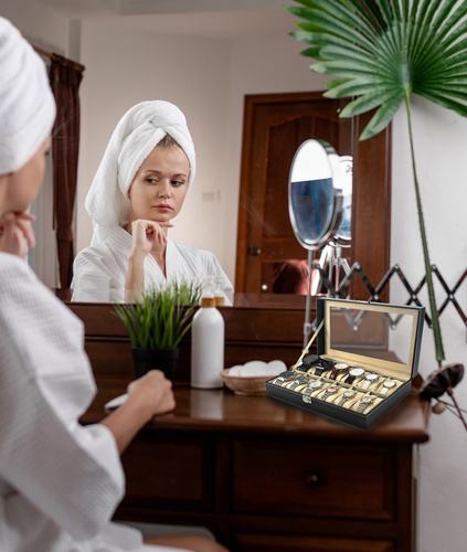 - SICHER IM INNEREN – das Innere des Organizers ist mit weichem Material ausgekleidet, Dank der Kissen sind die aufbewahrten Accessoires vor Kratzern geschützt , jedes davon ist abnehmbar, wodurch Auch anderer Schmuck, wie Armbänder, Anhänger, Ringe oder Ohrringe können wir dort unterbringen . Die Fächer sind durch höhere Wände voneinander getrennt, was das aufbewahrte Zubehör vor ungewolltem Kontakt und damit möglichen Beschädigungen schützt.
