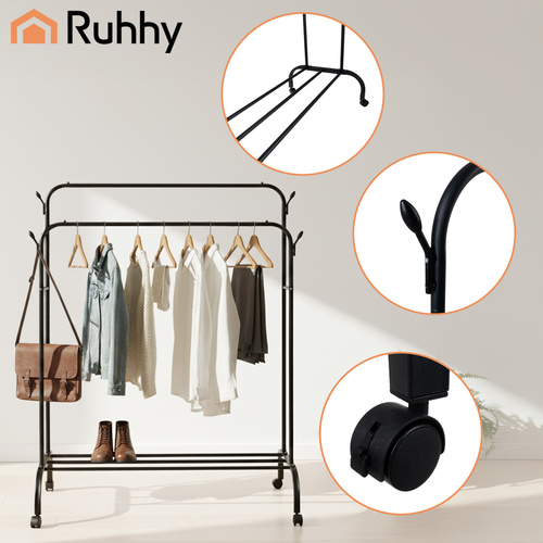 Suchen Sie nach einer cleveren Lösung für Ordnung in Ihrem Kleiderschrank, Flur oder Büro? Die Ruhhy Doppelgarderobe bietet viel Platz für Kleidung und Accessoires und lässt sich dank der feststellbaren Rollen mühelos verschieben. Ihre robuste Konstruktion mit Eisenrahmen und praktischer unterer Ablage sorgt dafür, dass Ihre Kleidung stets griffbereit und in perfektem Zustand ist.