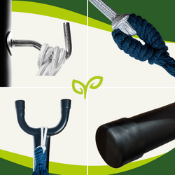 pritvirtinti, geriausia naudojant hamako mazgus, karabinus arba specialias rankenas.