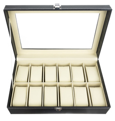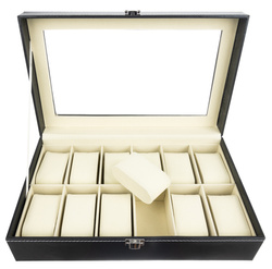 Elegantiška dėžutė turi 12 skyrių akiniams, laikrodžiams ir kitiems papuošalams. Dėžutė yra elegantiškos juodos spalvos ir baltų siūlių, kurios suteikia visumai elegancijos ir stiliaus . Dėklo dangtis yra skaidrus, todėl laikrodžių dėžutė gali būti naudojama ne tik daiktams laikyti ir tvarkai palaikyti, bet ir elegantiškai eksponuoti.