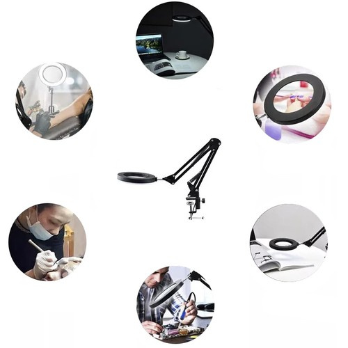 - SPECIFIKACIJA - spalva: juoda; medžiaga: geležis; kiti: PP + stiklas + guma; foninis apšvietimas: LED; šviesos diodų skaičius: 72; didinamasis stiklas: yra x 3; šviesos spalva: šiltai balta, neutrali ir šaltai balta; šviesos intensyvumo lygių skaičius: 10; didinamojo stiklo skersmuo: 10,5 cm; didžiausias stalviršio storis šviestuvui tvirtinti: 5 cm; matmenys: 65 x 15 x 5 cm; svoris: 640 g; Supakuoto svoris: 1,037 kg.