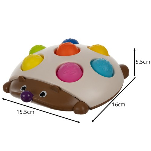 - JUTIMŲ STIMULIACIJA – kiekvienas iš 7 ežiuko burbulų turi skirtingą tekstūrą , stimuliuoja vaiko lytėjimo jautrumą . Vaikai gali liesti skirtingus paviršius, o tai leidžia jiems suprasti skirtingas objektų tekstūras. Su šiuo žaislu mažyliai gali lavinkite savo pažintinius įgūdžius tyrinėdami skirtumus tarp lygių ir šiurkštesnių paviršių. Spalvingi, įvairiaspalviai elementai pritraukti dėmesį ir skatinti bendravimą, lavinantis regimąjį suvokimą .