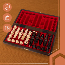 Šachmatai, pagaminti iš natūralaus skroblo medienos, yra ne tik žaidimas – tai stilingas interjero elementas ir unikalios dovanos idėja. Rakinama šachmatų lenta lagamino pavidalu su įdėklais užtikrina patogų figūrų laikymą ir saugumą. Pusiau matinis lakas, klasikinės spalvos ir rafinuotos detalės suteikia žaidimui prestižinį charakterį nuo pat pirmojo ėjimo.
