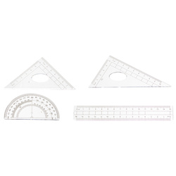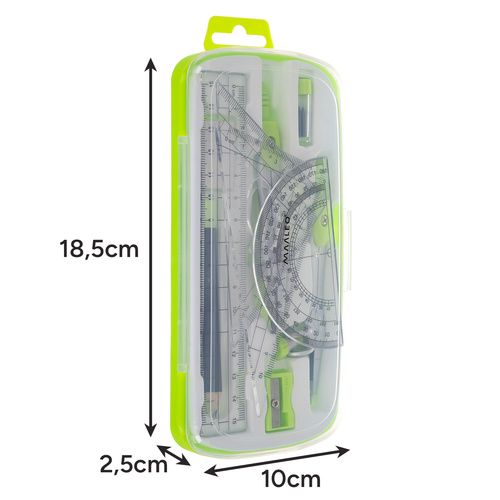 Geometrinis 10 elementų rinkinys, liniuotė, skriestuvas, kampamatis, mokyklinis stačiakampis, MAALEO!