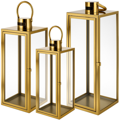 Trijų elegantiškų žibintų rinkinys su auksine apdaila, pagamintas iš patvaraus plieno ir stiklo. Puikiai tinka sukurti žavingą atmosferą namuose, sode, terasoje ar švenčių metu . Įvairūs dydžiai leidžia efektyviai išdėstyti lemputes, o rankena ir atidaromos durelės užtikrina patogų naudojimą. Puikiai tinka LED žvakėms, arbatinėms žvakutėms ir gėlių dekoracijoms – bet kokiai progai.