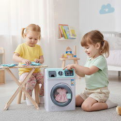 interaktyvus žaislas – skalbimo mašinoje yra daug realistiškų elementų, tokių kaip atidaromos durelės, besisukantis būgnas su kamuoliukais, temperatūros nustatymo rankenėlė, skydelis su mygtukais, skalbimo priemonių stalčius ir garso efektai, Tokia įvairovė leidžia vaikams prisiimti mažo namų ūkio nario vaidmenį ir suvaidinti kasdienes scenas iš realaus gyvenimo.