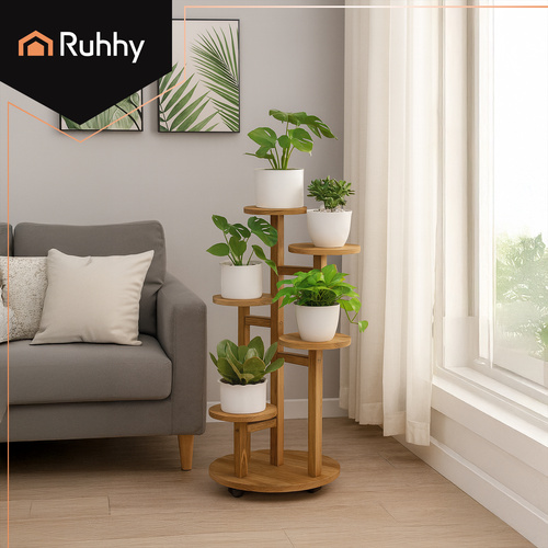 Stylowy i funkcjonalny kwietnik RUHHY z naturalnego drewna sosnowego pomieści, aż 7 doniczek na 6 poziomach. Idealny do salonu, na balkon lub taras – zapewnia efektowną ekspozycję roślin, oszczędność miejsca i łatwość w aranżacji. Dzięki kółkom z blokadą łatwo go przestawisz, gdzie tylko zechcesz.