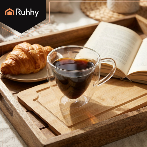 Szklanka Ruhhy 240 ml łączy elegancję i funkcjonalność. Jej wewnętrzny kształt serca pięknie podkreśla kolor napoju, a podwójne ścianki zapewniają izolację termiczną, dzięki czemu gorąca kawa nie parzy w dłonie, a zimne napoje dłużej pozostają chłodne. Wykonana ze szkła borokrzemowego sprawdza się podczas codziennego użytkowania, zachowując lekkość i trwałość. To stylowy dodatek do kuchni oraz doskonały pomysł na upominek.
