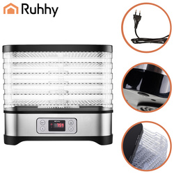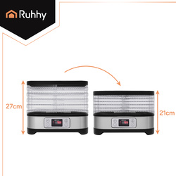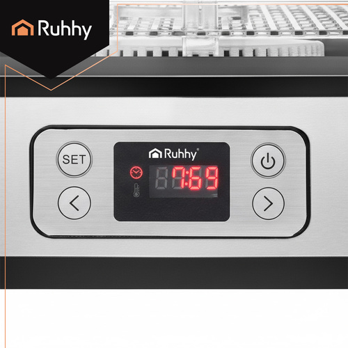 Хотите, чтобы ваши домашние запасы были готовы круглый год? Дегидратор RUHHY быстро и равномерно сушит грибы, фрукты, овощи и зелень. До 5 лотков (объём 10 литров), точный контроль температуры от 35 до 70 °C, 24-часовой таймер и ЖК-дисплей обеспечивают полный контроль над процессом — удобно, чисто и экономично. В комплект входят практичные лотки, коврики и сита, нож «3 в 1» и щипцы.