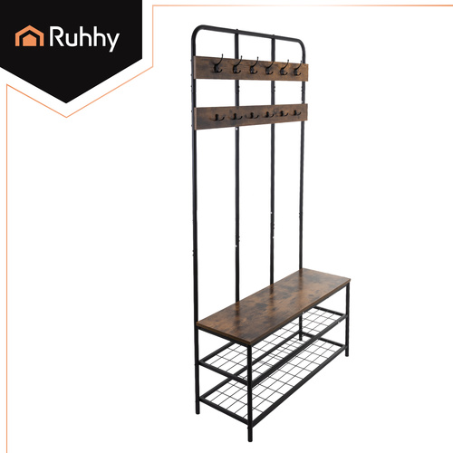 Вертикальная полка Ruhhy с вешалкой - 182x100x35,5 см - скамья со сиденьем и 2 полками для обуви - 12 крючков для одежды - металлический каркас-чердак - устойчивый органайзер для прихожей