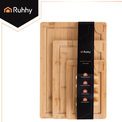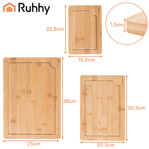 Набор кухонных досок Ruhhy 3-в-1 из бамбука с подставкой — разные размеры, канавки для стока жидкости, экологически чистый материал
